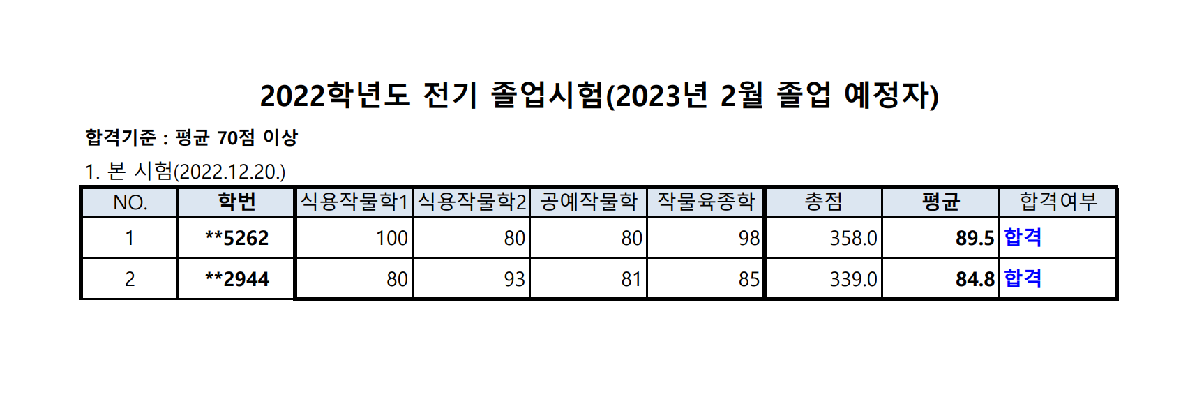 2022학년도 후기(2023년 8월 졸업예정) 졸업시험 결과 안내